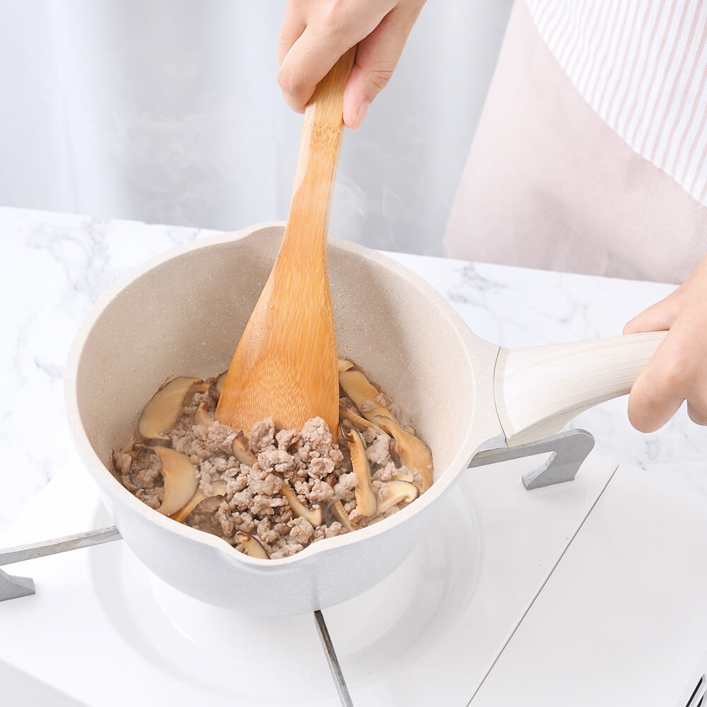 2. ในหม้อเดิม เทน้ำมันออก ใส่กระเทียมเจียวครึ่งนึงลงในหม้อ ตามด้วยหมูสับและเห็ดหอม ผัดพอเริ่มสุก