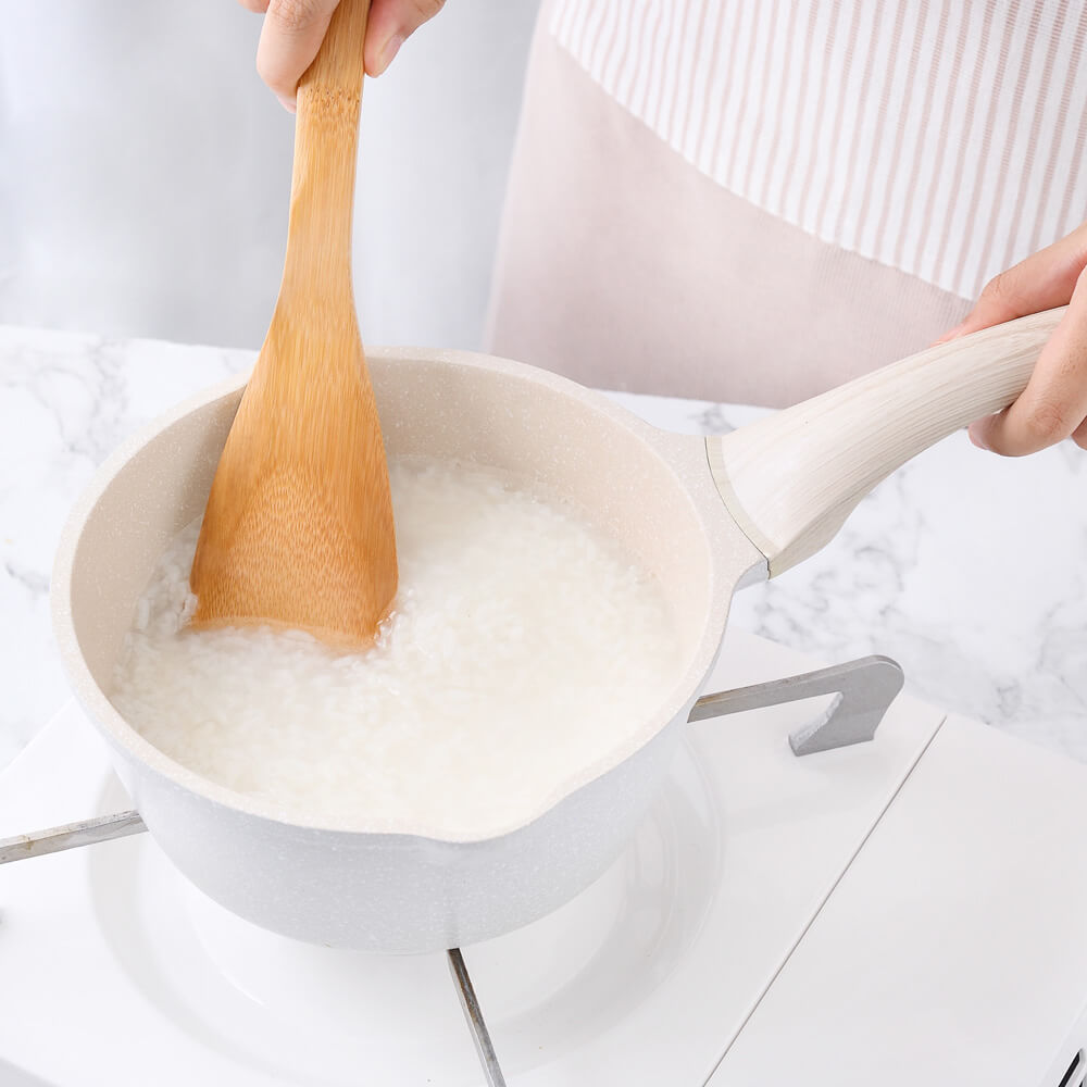 4. เติมน้ำลงไปในหม้อ ตามด้วยข้าวสวยลงต้มพอเริ่มเดือด ปิดไฟ (หากต้องการให้ข้าวนิ่มขึ้นสามารถต้มให้นานขึ้นอีกได้)